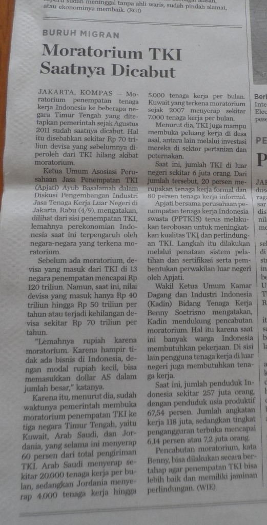 Apa yang dikatakan oleh Ayub Basalamah (Ketua Umum Apjati) “lemahnya rupiah kerana moratorium. Karena hampir tidak ada bisnis di Indonesia, dengan modal rupiah kecil, bisa memasukan dollar AS dalam jumlah besar”, sungguh tidak patut disampaikan. Karena dia mendapat makan dari BMI, BMI merupakan sumber penghidupannya. Sudah seharusnya dia menghormati hak-hak para BMI, bukannya mengkomodisasi mereka. Jelas sekali BMI merupakan tumbal para pelaku bisnis penempatan yang hedonis. Selain itu, faktanya, tidak ada variable langsung antara meningkatnya jumlah devisa dengan penguatan ruapiah (kompas, 7 September 2013).